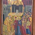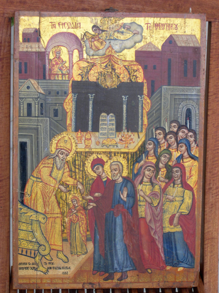 Βυζαντινή εικόνα των Εισοδίων της Θεοτόκου, στο πίσω μέρος της οποίας ο Καπετάν Μιχάλης έγραφε τις ημερομηνίες γεννήσεως των παιδιών του.9