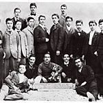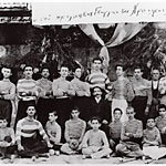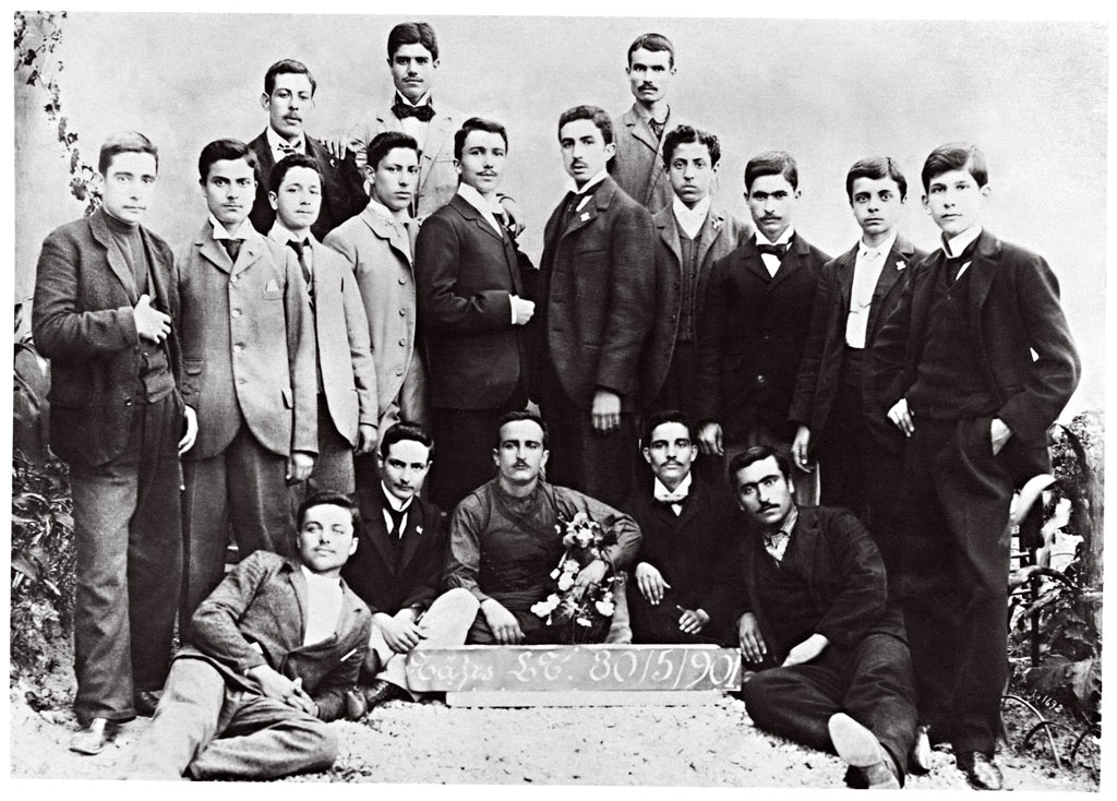Ο Νίκος Καζαντζάκης (πέμπτος από αριστερά) με συμμαθητές του στο Ηράκλειο, σε γυμναστική επίδειξη. 1899.