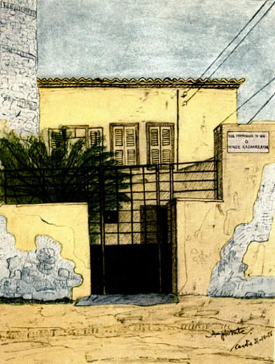 Το πατρικό σπίτι του Νίκου Καζαντζάκη στο Ηράκλειο της Κρήτης. (Σχέδιο τής Αμφιτρίτης Γ. Πετρέα. 1956.)