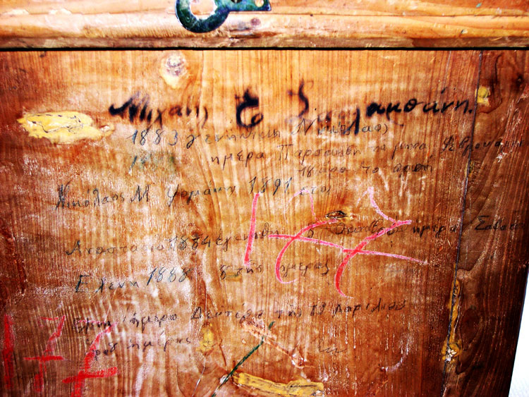 Βυζαντινή εικόνα των Εισοδίων της Θεοτόκου, στο πίσω μέρος της οποίας ο Καπετάν Μιχάλης έγραφε τις ημερομηνίες γεννήσεως των παιδιών του.