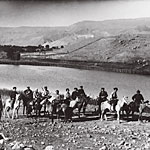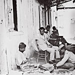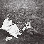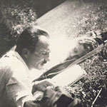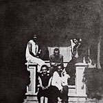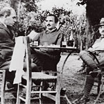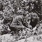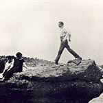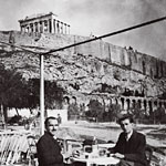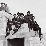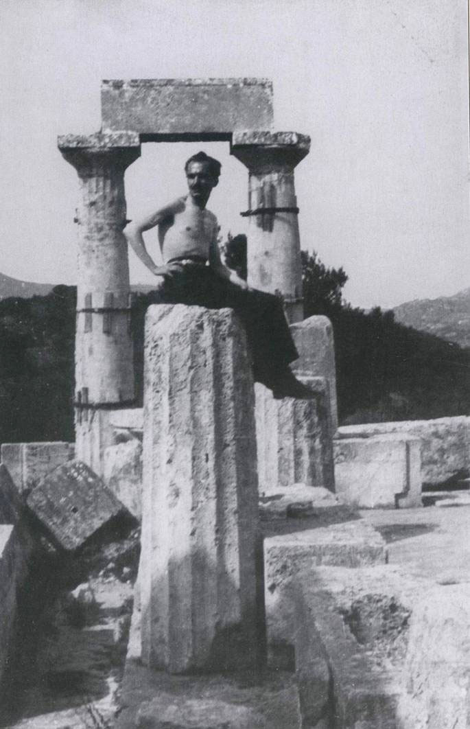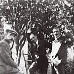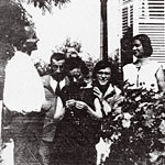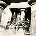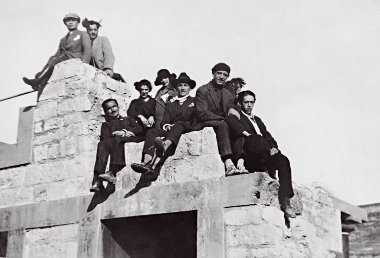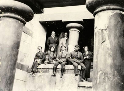 14. Ο Νίκος Καζαντζάκης με τον μουσουργό Δημήτρη Μητρόπουλο (καθήμενος προς τα δεξιά, με μπερέ) στην Κνωσό. Πίσω από τον Καζαντζάκη η Νίτσα, σύζυγος Μιχαήλ Αναστασίου και η Αμαλία, σύζυγος Λευτέρη Αλεξίου (με το καπέλο). Οι άλλοι είναι φίλοι του Δημήτρη Μητρόπουλου. Ψηλά καθήμενος με τραγιάσκα, ο Γιώργος Περδικάρης. 1925.