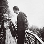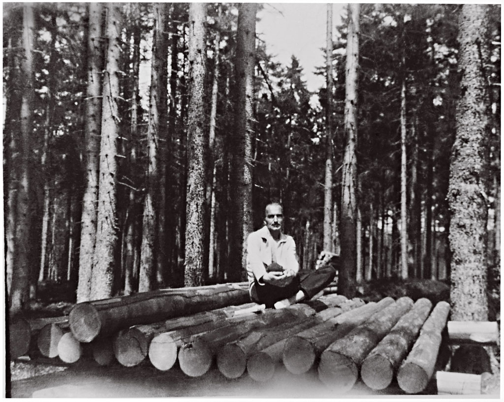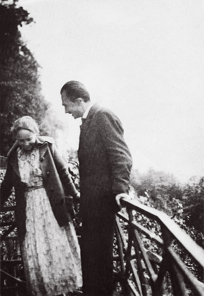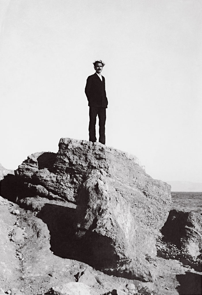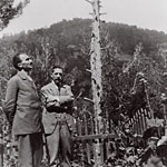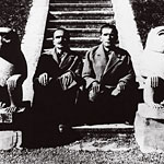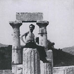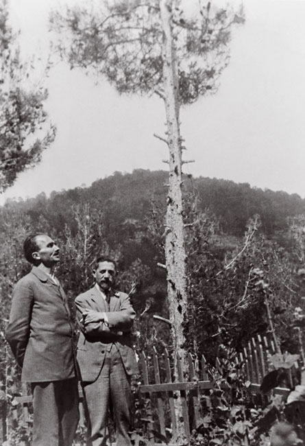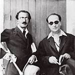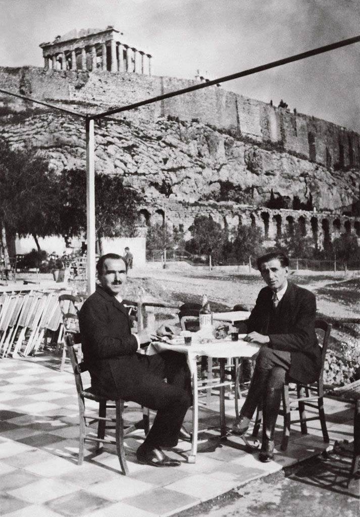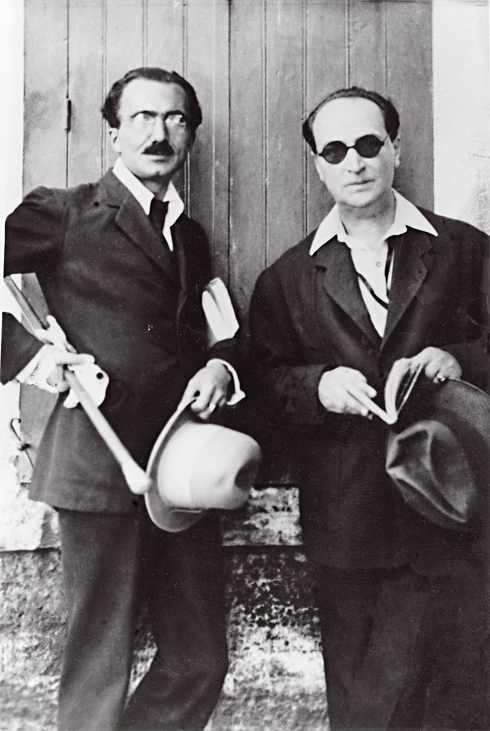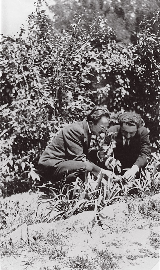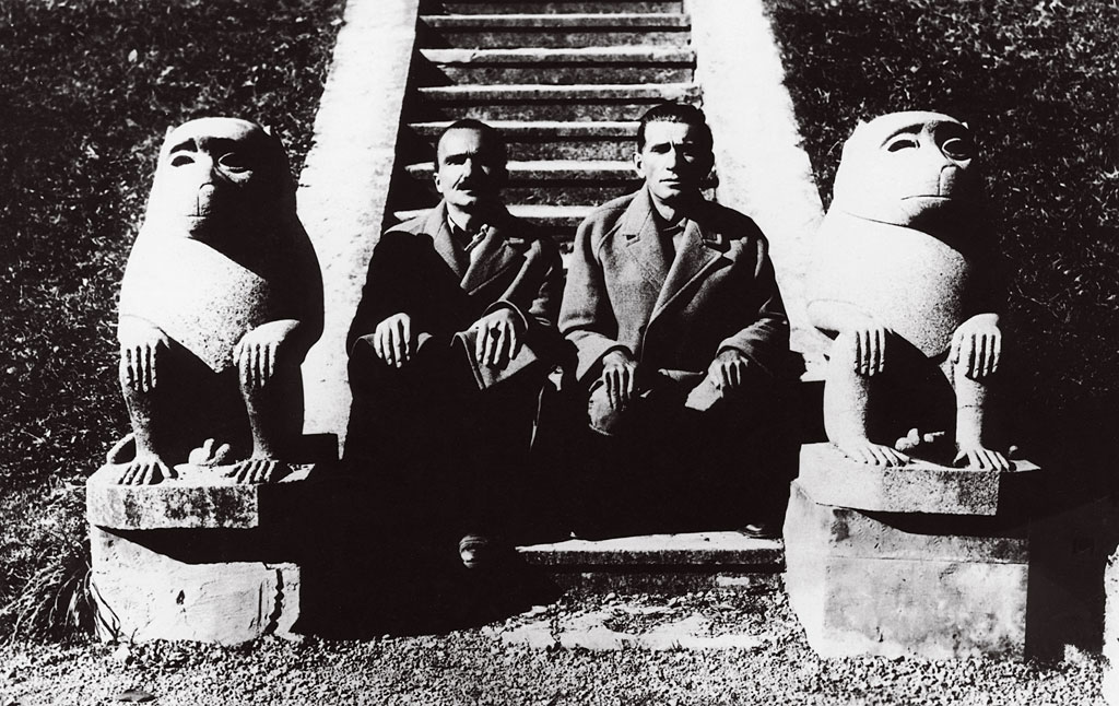 31. Ο Νίκος Καζαντζάκης με τον Παναΐτ Ιστράτι στον «Τροπικό Κήπο» του Borjom, ανάμεσα σε δύο αρχαία αιγυπτιακά αγάλματα πιθήκων, τους οποίους μιμούνται. 1928.