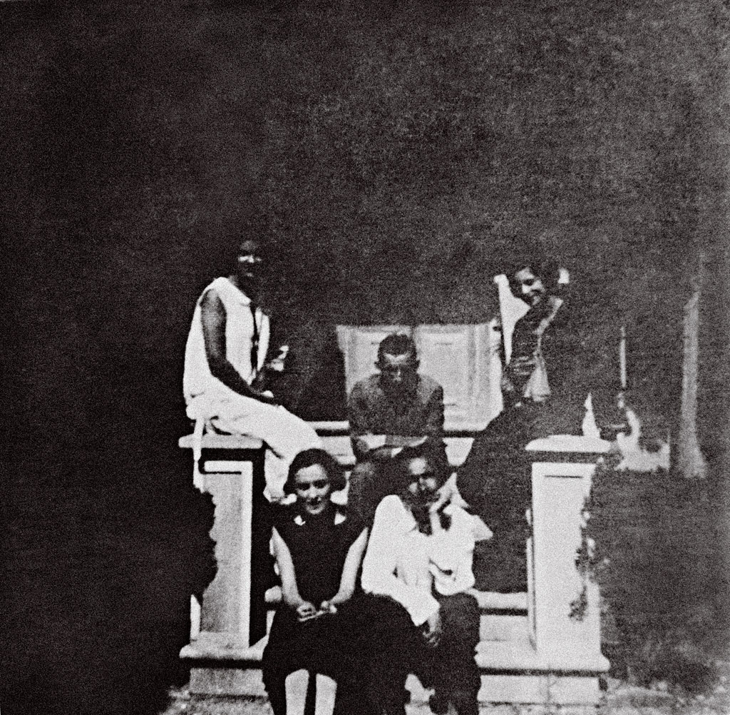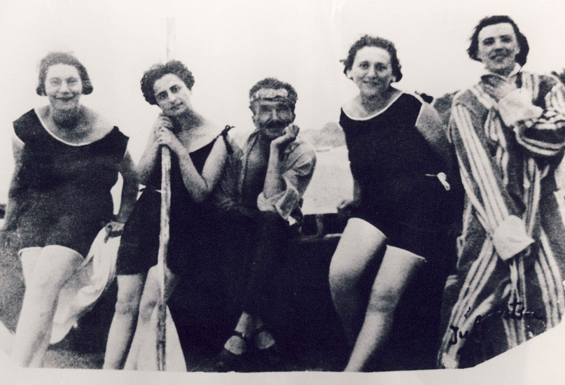 7. Ο Νίκος Καζαντζάκης με τη Ραχήλ Λίπσταϊν (Rahel Lipstein) (ακουμπά στον ώμο του), τη Ντίνα Μάτους (Dina Matus) και δύο φίλες τους στο ψαροχώρι Pustchow, κοντά στο Rewald (Γερμανία) στη Βαλτική θάλασσα. Ιούλιος 1923.