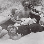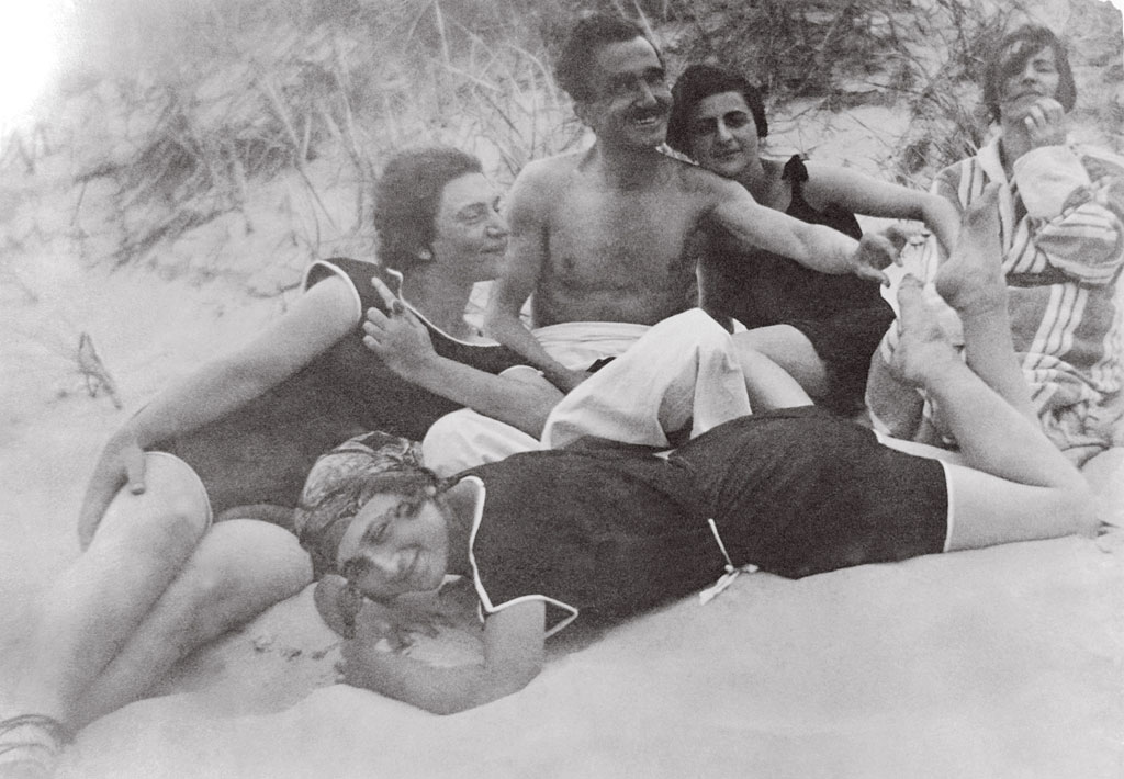 8. Ο Νίκος Καζαντζάκης με τη Ραχήλ Λίπσταϊν (Rahel Lipstein) (ακουμπά στον ώμο του), τη Ντίνα Μάτους (Dina Matus) και δύο φίλες τους στο ψαροχώρι Pustchow, κοντά στο Rewald (Γερμανία) στη Βαλτική θάλασσα. Ιούλιος 1923.