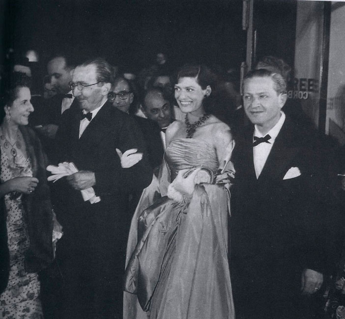 23. Από την πρεμιέρα στις Κάννες της ταινίας του Ζύλ Ντασσέν (Jules Dassin) Εκείνος που πρέπει να πεθάνει, βασισμένης στο μυθιστόρημα Ο Χριστός ξανασταυρώνεται. Ο Νίκος Καζαντζάκης με την Ελένη και ο Ντασέν με τη Μελίνα Μερκούρη. Απρίλιος 1957.